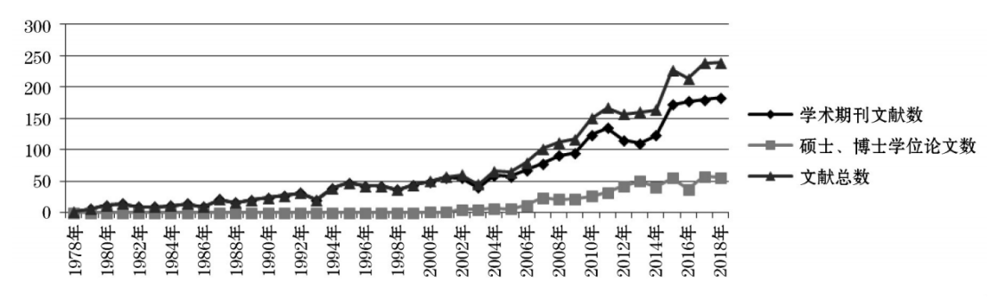通过梳理和统计民族教育政策相关研究文献可以发现(见图1),从数量上看,1978~2018年间的相关文献共有2302篇;从文献变化趋势看,1978~2018年间的相关文献呈现不断增长的趋势,进入2000年,尤其是2005年之后有明显加快的趋势,2000年以后,硕士、博士学位论文关注民族教育政策的相关内容逐渐增多。民族教育政策相关研究文献数量的变化与国家对民族地区教育发展的关注程度密切相关。民族教育政策是为解决特定时空背景下民族地区各类教育问题而制定的,不同时期的各类民族教育政策都深深地打上了时代烙印。《中共中央国务院关于进一步加强民族工作加快少数民族和民族地区经济社会发展的决定》明确提出,“要扶持民族地区教育事业的发展,进一步加强民族地区人力资源的开发,并将二者作为促进民族地区社会经济发展的主要途径和手段”;教育部在贯彻《决定》的通知中进一步强调,要“促进民族地区基础教育、职业教育、高等教育改革与发展,做好民族地区的‘双语’教学和科研开发,培养民族地区师资队伍”。上述政策文件出台后,我国民族教育政策研究成果呈现快速增长趋势。