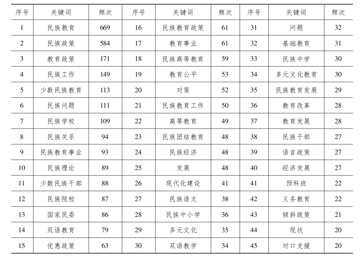 表1改革开放40年来民族教育政策研究高频关键词统计(TOP45)