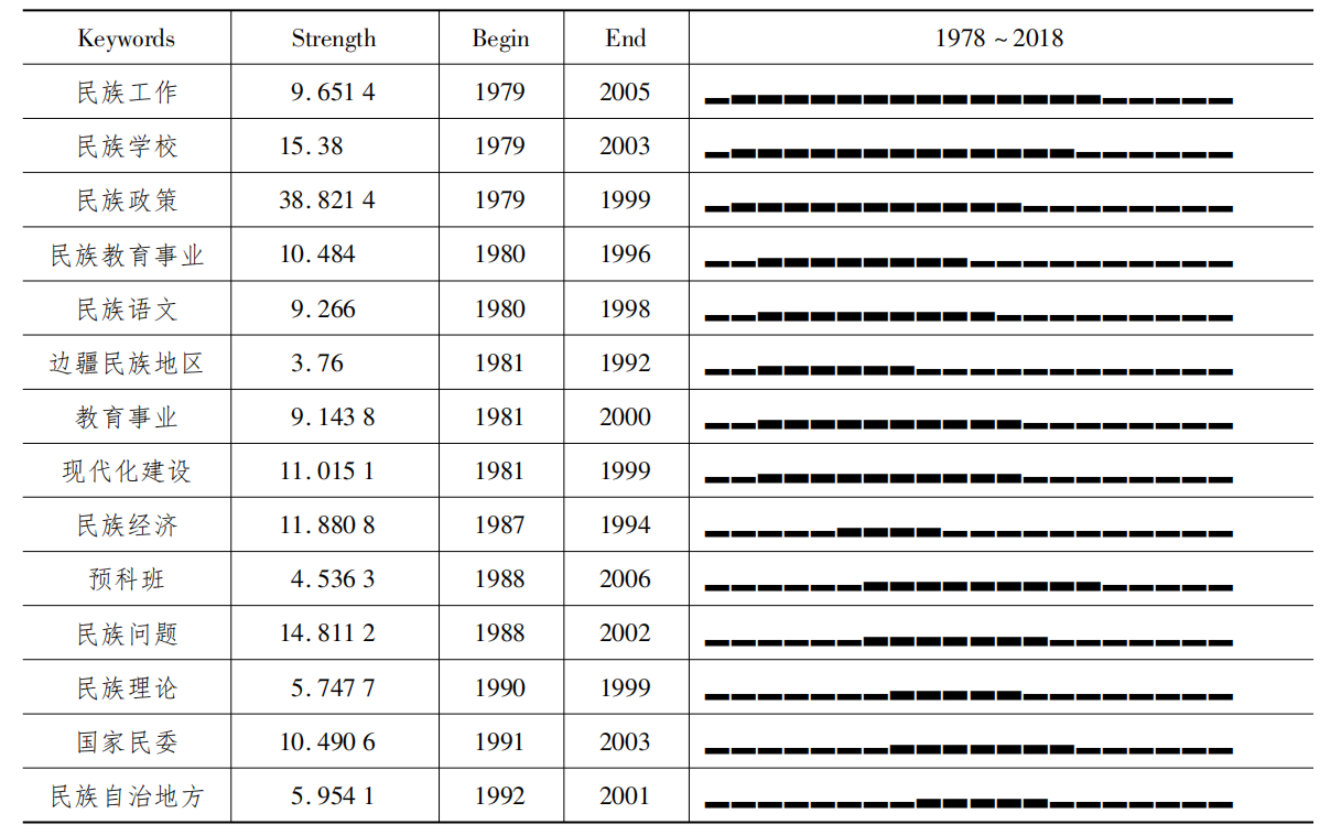 表2改革开放40年来民族教育政策研究文献关键词突现率(TOP15)