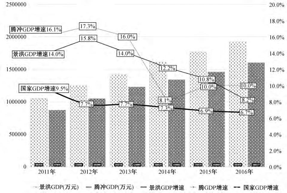 图1 景洪、腾冲两地2011-2016年生产总值及其增长速度