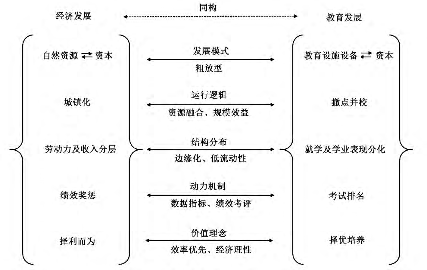 将经济与教育这两个社会子系统视为两个元素的集,探寻二者之间元素——如发展模式、运行逻辑、结构分布、动力机制、价值理念等的对应关系;如果教育发展与经济发展是同构的,那么其特征与结论也应相互适用。首先,这种映射关系不是单个因素的简单对应,而是在具有一定结构的系统因素之间的关系;其次,它不同于S·鲍尔斯和H·吉丁斯的对应理论(Correspondence Principle),该理论是以教育与经济的关系这一视角来阐释学校教育和社会结构的阶层化问题,具体包括管理者与教师、师生、生生之间以及学生与作业之间的关系,都一一对应地复制了资本主义劳动过程中的等级结构关系。[29][30][31]