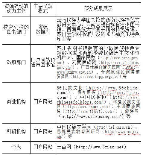 我国民族教育信息资源数字化建设在国家政策的导向下也取得了一些成果,主要体现为:(1)电子出版物的建设,如电子书刊、光盘文献等;(2)资源数据库的构建;(3)门户网站的搭建。为了清晰有效地进行研究与归纳,本文选取了资源建设的动力主体这一参考对象对相关成果进行总结,如表1所示。