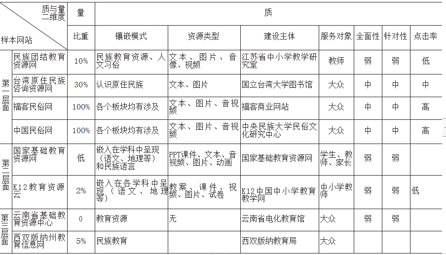 第三层面,为保证针对性,鉴于以云南区域民族教育信息资源数字化为出发点,故选取云南本地的相关资源网站来分析,选取了相关度最高的6个样本网站:云南省电化教育馆(云南省基础教育资源中心)、西双版纳州教育信息网、云南民族网、云南省民委、傣族网、纳西族网。
