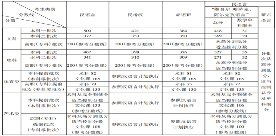 表1新疆维吾尔自治区 2018 年普通高校招生各批次最低投档控制分数线