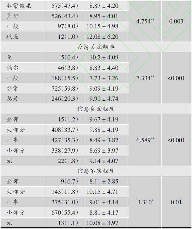摘 要:目的调查新型冠状病毒肺炎(Coronavirus Disease 2019,COVID-19)疫情爆发初期,我国网民的焦虑情况及其影响因素。方法 本研究为横断面研究,于2019年1月28日至2月4日期间,在问卷星平台针对我国网民采用滚雪球抽样进行网络问卷调查,内容包括一般资料和GAD-7广泛焦虑障碍量表。采用SPSS24.0的统计学软件,进行单因素分析,Pearson相关检验和多元线徃回归分析,确定焦虑情况影响因素。结果 有效收集3111份网络问卷,其中焦虑人数1210人,占总人数38.89%,GAD-7评分均值为9.04±4.231。GAD-7量表得分在婚姻状况、信息不实程度等方面有统计学差异(P<0 .05),在学历程度、身体状况、疫情关注频率、信息负面程度等方面有显著差异(p<0.01),在性别、年龄、工作所在地等方面无统计学差异。pearson相关性检验和多元线性回归证明,学历程度与gad-7量表得分成负相关(b="-0.795),疫情关注度、信息负面程度、身体状况、信息不实程度、婚姻状况都与GAD-7量表得分成正相关。(b=" 0.733,0.554,0.414,0.362,0.450,p<0.05)结论新型冠状病毒肺炎疫情早期,大部分人群存在轻度焦虑情绪。学历程度、婚姻状况、身体状况、疫情关注频率、信息负面程度、信息不实程度是其影响因素。