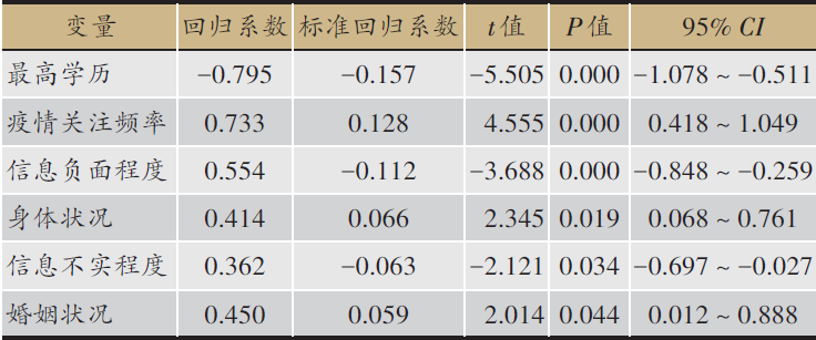 注:变量赋值情况:婚姻状况 未婚=1,已婚=2,离异=3,丧偶=4;最高学历 小学及以下=1,初中及在读=2,高中及在读=3,大学及在读=4,博士、博士在读及以上=5;身体非常健康=1,良好=2,—般=3,较差=4;疫情关注频率,无=1,偶尔=2,一般=3,经常=4,总是=5;负面信息获取占比,无=1,小部分=2,一半=3,大部分=4,全部=5;不实信息获取占比,无=1,小部分=2,一半=3,大部分=4,全部=5。回归方程中,R2=0.062, F=14.343,P<0 .001。
