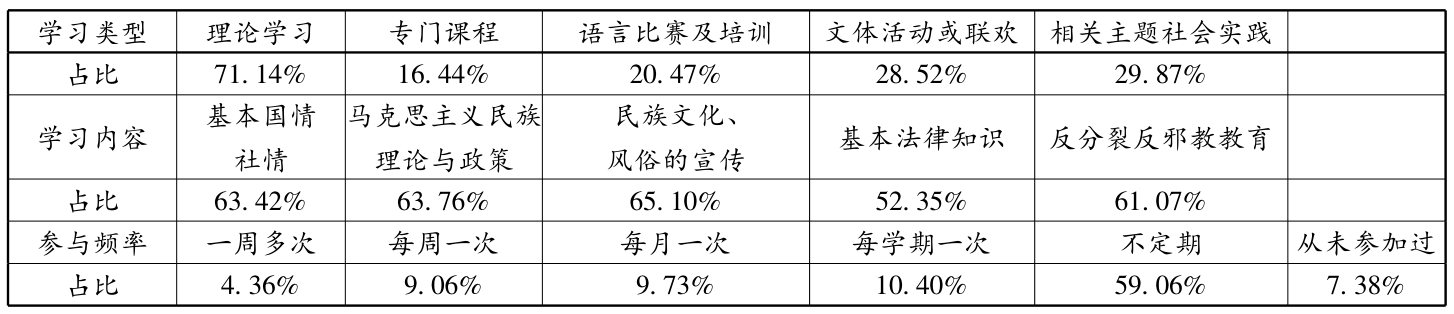 根据问卷统计结果,39.93%的学生了解或听说过“石榴树”工程。在此基础之上。以“民族团结进步教育”为主题,受访同学参与过的学习类型、学习内容及频率如表2所示: