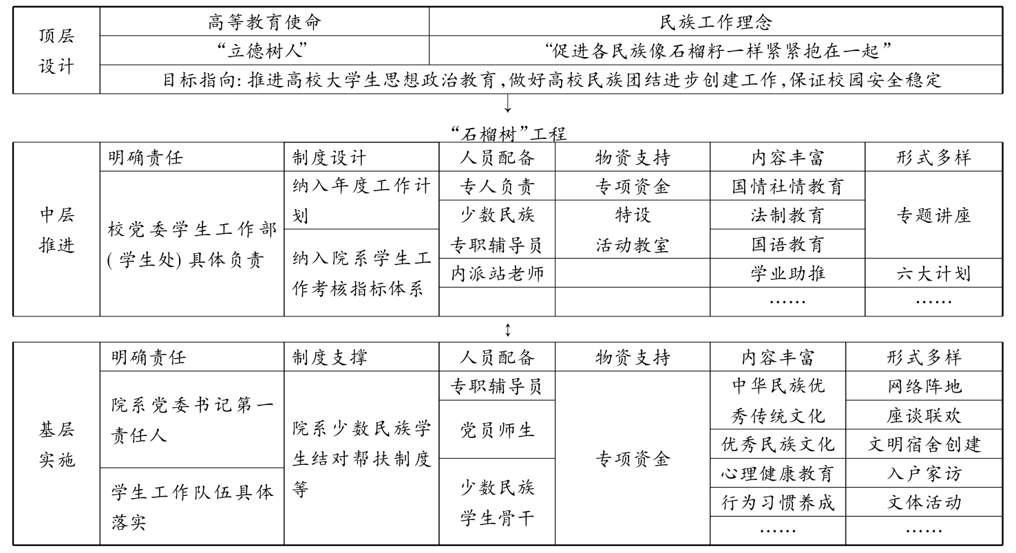 “石榴树”工程既是一种育人实践模式,更是一种民族团结进步教育的实施机制。机制指“一个工作系统的组织或部分之间相互作用的过程和方式”[12]。它涉及工作领导、制度设计、分工协同、配套保障、方式方法等一系列内容。作为一种具有独特价值的组织设计,“(良好的)民族团结机制可以汇聚各民族的行为预期,提供信息沟通渠道,……协调和调整各民族的目标和行为,进而增进民族团结。”[13]历经两年的实践探索,“石榴树”工程以促进校园文明秩序、提升民族团结进步教育质量为目标,秉承“主动作为、充分关爱、严格管理”的工作理念,形成了民族团结进步教育、少数民族学生管理服务与通识教育并举的主体设计和实践模式,有效促进了校—院两个层面的良好互动。