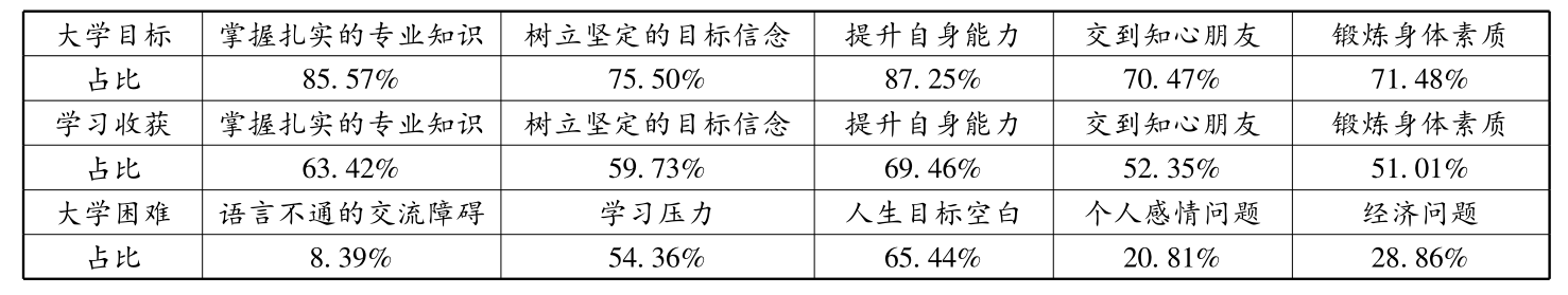 受访学生对大学期望、收获和困难的调查问卷结果如表3所示: