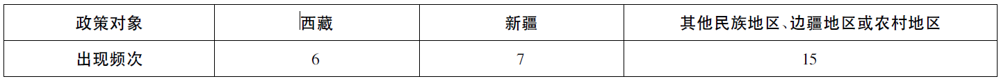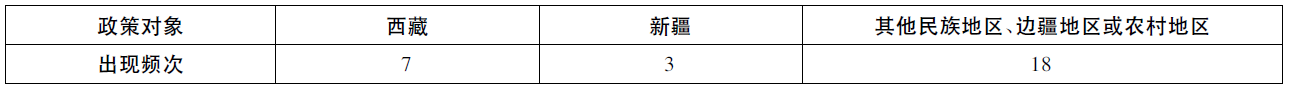 党的十八大后,民族地区教育对口支援的重点任务之一是提升民族教育的自我发展能力,即培养民族地区教育内生发展能力。2015年《国务院关于加快发展民族教育的决定》提出“激发民族地区内生潜力”,对民族地区教育事业的发展具有指导意义,此外,近年来陆续实施的21份有关民族地区教育对口支援的政策文件也为教育对口支援实践提供了新的目标指引。由此,在政策主体分布方面(如表9),中央机关和地方政府仍是推进教育对口支援的主力,突出反映在共计22项政策条目中;东西部地区的重点大学、职业院校则在其中继续扮演着重要角色,共有10项政策条目涉及;各种社会力量也更加积极地参与到民族地区教育对口支援中,共计5项。在政策对象方面(如表10),西藏、新疆的教育发展一如既往受到重视,共计有13份专项政策;中西部其他民族地区、边疆地区或农村地区的教育发展也通过不同形式的政策照顾,在15条政策内容中反映出来。