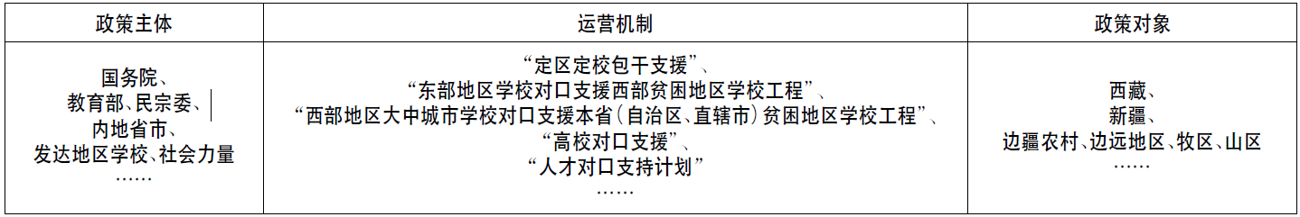 从公共政策要素维度出发,我们认为民族地区教育对口支援的政策要素由政策主体、政策对象、政策内容、政策环境与政策运用机制等组成。结合民族地区教育对口支援的实际情况,政策主体既有决策、执行的主体,又有监督主体,具体包括中央机关、对口各地方政府部门、民族地区学校以及社会力量等;政策对象主要是指中西部经济欠发达地区,特别是边疆农村、边远地区、牧区、山区等;政策内容就是针对这些地区在基础教育、职业教育、高等教育、师资力量、财政分配等方面给予支持;政策环境是政策制定和实施的客观条件,在不同的社会经济条件下,政策环境也会存在差异;政策运用机制则是在特定政策环境中,政策主体作用于政策对象过程中采用的手段或方式。在民族地区教育对口支援政策的演进中,这些政策要素综合地表现在不同时期与不同类型的政策文件中,较全面地呈现了民族地区教育对口支援发展的宏观轮廓。