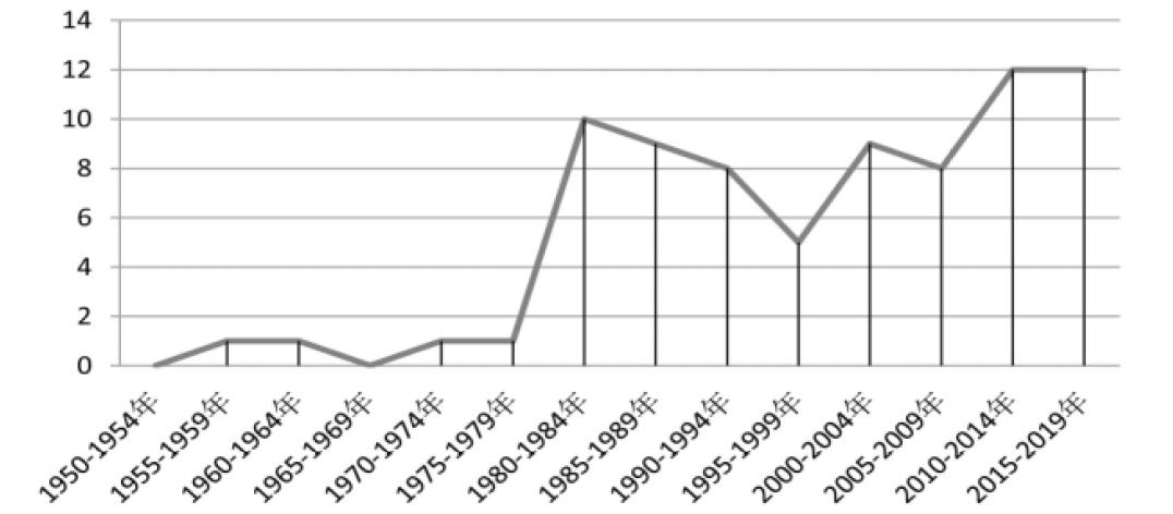 首先,研究中涉及的政策文本在民族地区教育对口支援的提法上有直接呈现和间接反映两种方式。具体而言,由于对口支援这一概念在1979年通过中央文件以国家政策的形式正式确定下来[7],因此20世纪70年代前的政策文本在内容上主要是间接反映民族地区教育对口支援政策要素,至改革开放后则更多在字面上直接呈现民族地区教育对口支援政策要素。其次,政府部门职能存在交叉情况,特别是教育主管部门和民族宗教委员会都关注民族地区教育对口支援工作,研究中便会涉及多部门联合发布政策的情况,这是我国民族地区教育治理的一大特点。再者,民族地区教育支援政策具有一定延续性、系统性、权威性,前一阶段的政策往往会为后续的政策创造条件,后一阶段的政策则是对前一阶段的政策进行补充与发展,因而,同一主题的民族地区教育对口支援内容在不同的政策阶段都有涉及。为表现得更加简洁、直观,我们规定自20世纪50 年代至今,以5年为一时间单元对政策样本进行统计,可知民族地区教育对口支援政策的计量变化趋势(如图1),总体上是逐年增多,期间也有小幅变化。