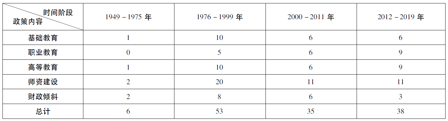 另一方面,民族地区教育对口支援不仅是一项系统性工程,也是处于不断变化发展中的一项具体工作。随着社会政治、经济的发展,教育对口支援的政策话语环境也发生着变化,势必导致政策对象诉求的差异化,即在不同的时期会有不同的教育发展需要,这就使得民族地区教育对口支援政策的着力点在不同时期内会有所不同。通过对政策内容的爬梳,我们发现民族地区基础教育、职业教育、高等教育、师资建设、财政倾斜这5 个方面的内容,在1949-2019年的呈现状态是变化发展的(如表3)。
