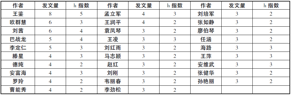 核心作者的测定依据,一般包括发文量和被引量。[2]首先,依据作者发文量的临界值M来判定该领域的高产作者。其计算公式M=0.749(Nmax)1/2。“M指最低发文量,Nmax指对应年限中论文发表数量最多作者的论文数量,当发表的论文数量达M篇以上时,该作者即为高产作者”。[3]由相关数据计算可知M=3,以此列出发文量≥3的作者。其次,依据所发文章的被引频次推算出每位高产作者的h指数。“根据Hirsch的定义,一位学者的h指数等于其发表了h篇至少被引h次的论文”。[4]由表1可知,民族文化类校本课程研究中,h≥3的有12名核心作者。