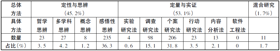 本研究主要借用胡来林、安玉洁对教育技术学的分类方法,将民族文化类校本课程的研究方法分为“定性与思辨”“定量与实证”“混合研究”三大类,每一大类中再分成多种具体研究方法。[5]通过对相关648篇文章进行逐一分析,并借助excel等图表工具可得出相关数据(见表2)。