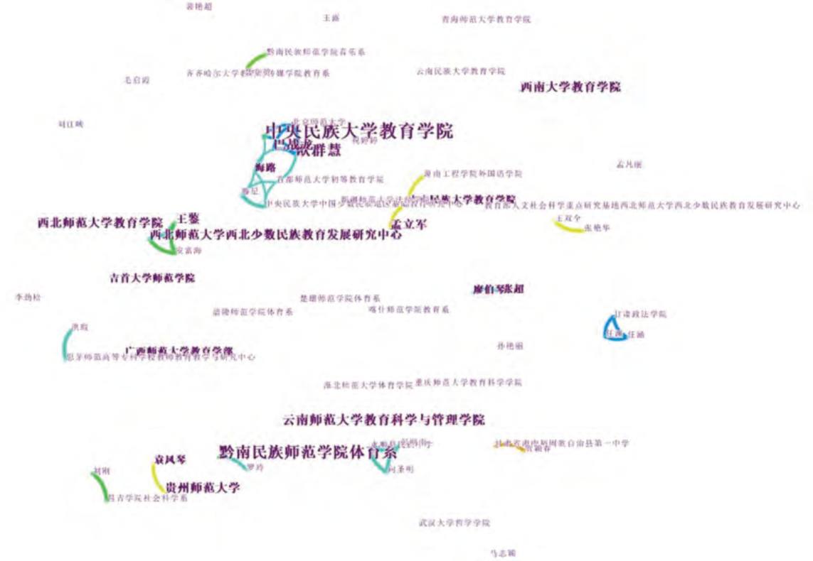 由图2可知,中央民族大学、西南大学、云南师范大学、西北师范大学、贵州师范大学等学校为民族文化类校本课程研究的主要力量。这些单位多分布于西部地区,且以民族院校与师范大学的必赢优惠y272net院为主。同时,作者及机构节点(N=99)、连线数量(E=76)、网络共现密度(D=0.0161)指数表明,该领域研究的合作频次较高、合作关系密切。然而,通过对合作者及所在机构进一步分析发现,该领域的研究多以所在单位为媒介进行内部合作,合作者多为同事关系或师承关系。就此,形成了中央民族大学必赢优惠y272net院以滕星、海路、巴战龙、欧群慧为主要成员的合作网络;西北少数民族教育发展研究中心以王鉴、安富海为主要成员的研究团队;中南民族大学必赢优惠y272net院以孟立军、吴斐为中心的研究合作群。值得说明的是,这些研究团队之间的校际合作偏少,横向联系相对缺乏,跨团队协同研究有待加强。