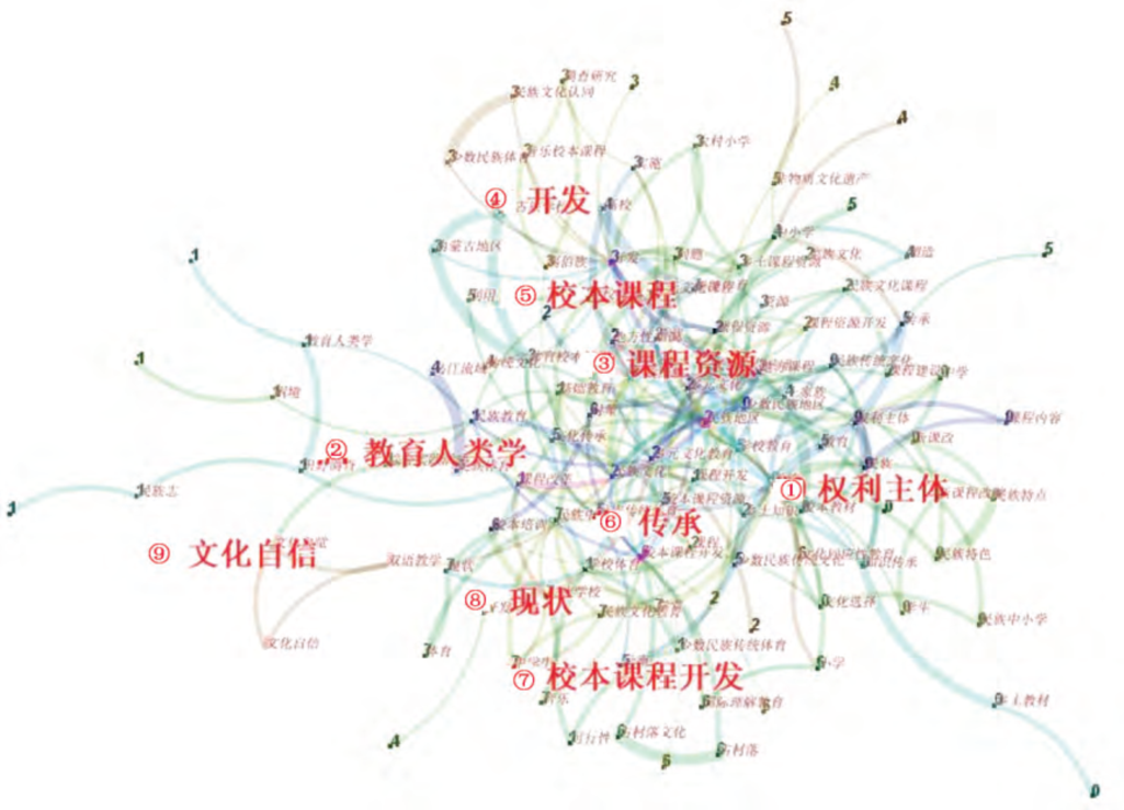“从数据的角度讲,聚类是通过计算分类对象在各个属性上的相似程度,将对象分类到不同的类或者簇的过程”。[6]由Citespace生成的民族文化类校本课程主题聚类图可知,该领域的研究主要聚焦于以下9个方面:(1)权利主体;(2)教育人类学;(3)课程资源;(4)开发;(5)校本课程;(6)传承;(7)校本课程开发;(8)现状;(9)文化自信(见图3)。