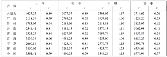 注:F1、F2分别代表生均经费均值(单位:元)和生均经费变异系数。