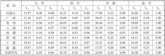 若以2014年全国31个省市L1、L2、L3均值为基准衡量,八省区除了小学阶段L1的“达标率”为37.5%以外,其余阶段L1的“达标率”均只有25%;L2指标,小学、初中的达标率均为50.0%、初、高中均全部达到或超过基准线;L3达标率则分别为25.0%、50.0%、37.5%、25.0%。上述统计分析表明,八省区以上各阶段师资投入无论是从数量还是质量上看,与全国平均水平差距仍然较大。