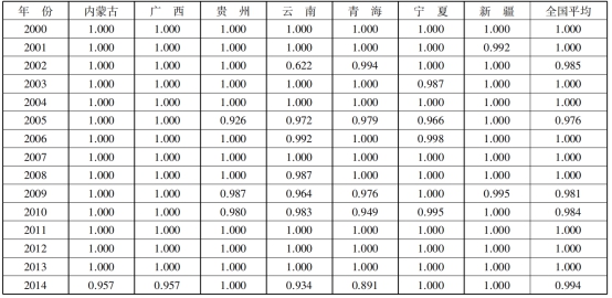 总体来看,全国教育投入促进人力资本积累的整体效率有10个年份DEA有效。八省区中除了云南以外,其他省区的整体效率均在全国平均水平之上。内蒙古和广西整体效率最好,新疆次之,云南末位。其中,内蒙古和广西除2014年外,其余年份整体效率值均DEA有效,DEA有效的年份占比93.33%。相比而言,云南15个年份中DEA 有效的年份有8个。