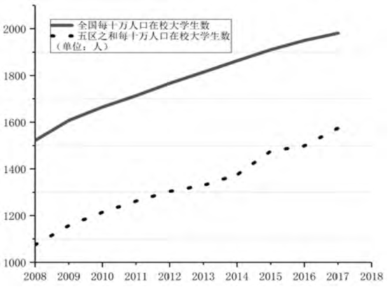 促进教育公平,推动民族关系和谐发展,是我国民族教育政策的基本价值取向之一[11]。如上所述,对于2008—2017年5个自治区高等教育发展的整体规模,无论是从与民族地区人口发展规模的适应性还是与民族地区经济发展规模的适应性,或是从高等教育本专科和研究生规模来看,其每十万人口在校大学生数、每亿元GNP 负担高校在校生数以及在校生数的发展规模和速度,与全国平均水平相比都还存在较大差距。国务院《关于加快发展民族教育的决定》(国发〔2015〕46号)提出,到2020年,我国民族地区教育整体发展水平及主要指标要接近或达到全国平均水平,逐步实现基本公共教育服务均等化。要实现2020年民族地区教育整体发展水平及主要指标接近或达到全国平均水平的目标,还需要进一步加大国家对民族地区教育的扶持力度,提高民族地区高等教育发展水平,从而进一步促进高等教育均衡化发展。考虑到历史欠账问题,民族地区受高等教育人口数与平均受教育年限都远低于全国平均水平,民族地区高等教育继续保持较高的增长速度是必要的。