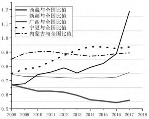 图4比较直观地展示了5个自治区每亿元国民生产总值本地高校在校大学生数与全国的比值。2008—2012年,西藏每亿元地区生产总值负担在校大学生数一直高于全国平均水平,但从2013年开始逐年下降并低于全国平均水平。宁夏与之相反,从2008—2012年每亿元国民生产总值负担在校大学生数一直低于全国平均水平,但从2013年开始上升并高于全国平均水平。新疆和内蒙古十年来一直低于全国平均水平。广西2008—2017年每亿元国民生产总值负担在校大学生数一直高于全国平均水平,且在2012年后高于其他4个自治区。除西藏外,其余4个自治区国民生产总值负担在校大学生数与全国平均水平相比,十年来基本处于上升趋势。