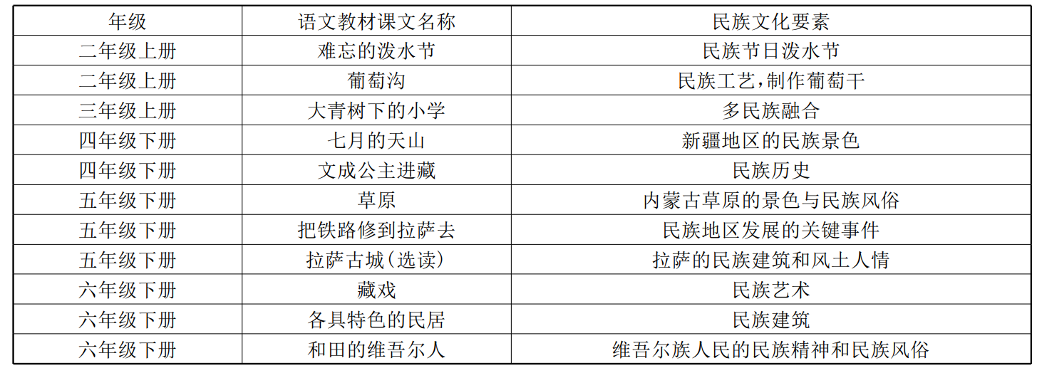 2009年,教育部在《学校民族团结教育指导纲要(试行)》中提出民族文化认同的概念,要求将民族文化与学校教育相结合,让学生认识民族文化,培养民族意识。2016年,《中国学生发展核心素养》中建议要培养学生的文化自信,必赢优惠y272net生尊重和继承中国优秀的民族文明成果。[1]学校教育作为基础教育阶段继承民族文化的主要场域,已经受到了各学科的共同关注,它有助于民族平等、团结和共同繁荣的民族政策有效实施。[2]因此,部编版语文教材中民族文化的构建既顺应了课程目标的培养要求,又增强了教材的文化适应性。