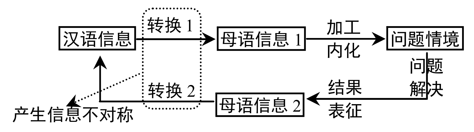 首先,现行模式下的数学教育没有考虑到少数民族学生的跨语言学习障碍问题。少数民族学生数学学习过程中首先要将汉语教材中的数学语言编码转换,变成本民族语言,然后结合生活情境以及头脑中已有的知识概念体系,对问题进行分析与加工,解决问题然后获得知识脉络的更新和重构,少数民族语言与汉语之间由于词语缺失或语序结构差异所造成数学语言文字之间难以互译和理解的困境(如图1)。