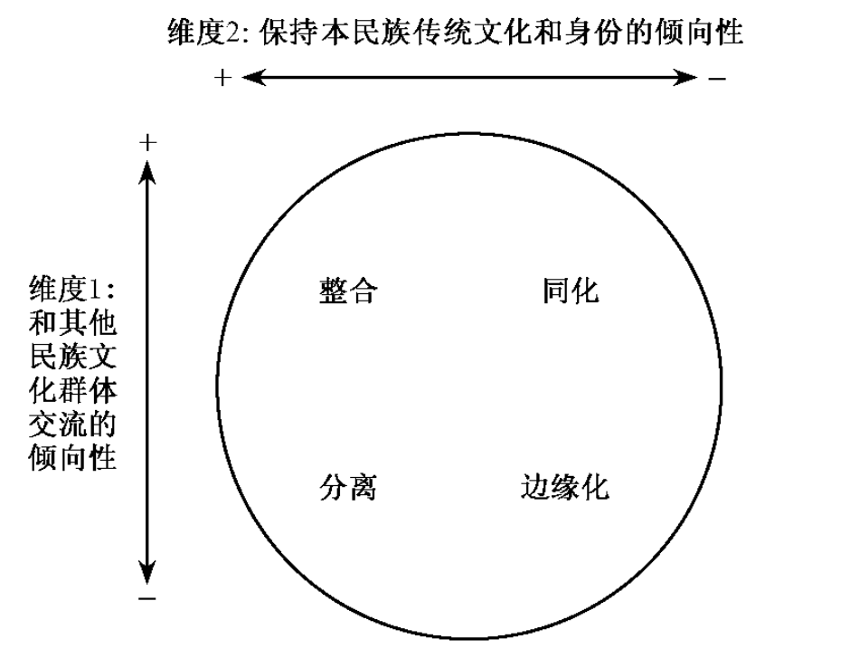 ①此图是笔者参考David L.Sam&John W.Berry,The Cambridge Handbook of Acculturation Psychology。UK:Cambridge University Press(2006)一书第21页资料编译而成,为便于中文理解,对原图中的个别文字,笔者略微作了技术性处理。