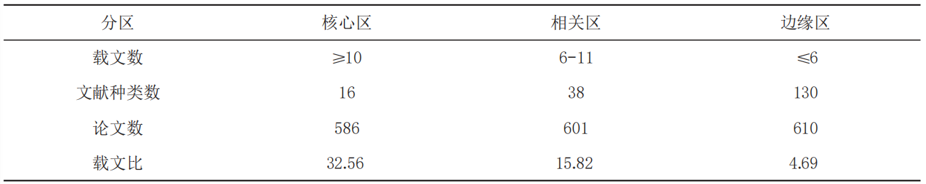 布拉德福定律(Law of Bradford)是由英国著名文献学家(B.C Bradford)于20世纪30年代率先提出的描述文献分散规律的经验定律,是文献计量学重要的三大基本定律之一。其基本内容为:如果将期刊按其论文刊载数量的多少,以递减顺序排列,那么可以把期刊分为专门面向这个学科的若干个区,各个区的文章数量基本相等,数量上成对比数列关系。根据该定律的原理,对我国教育人类学相关研究论文在期刊中的分布情况进行了分区分析(如表3所示),在经过统计分析后,笔者将其划分为三个区,分别为核心区、相关区与边缘区,这三个区的论文数量大体相等,而且相继各区的期刊数基本成等比数列,布氏系数近似为6。核心区有16种文献种类,占期刊总数的8.6%,每刊载文在10篇及以上,在2007-2016年期间共刊载586篇论文,平均载文比为32.56,远高于相关区的15.82和边缘区的4.69。由此可见,教育人类学的主要研究论文发表的文献较为集中,研究者对研究成果也存在较大的共识,这对于教育人类学的理论发展大有裨益。