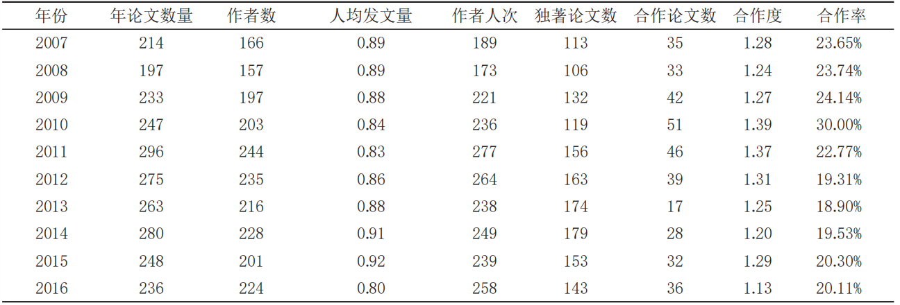 科学研究作为一项特殊的集体劳动,由于学术研究的特殊性,优秀的学术论文通过合作才能充分发挥每位学术工作者的长处,同时来弥补其知识结构、研究方法等方面的不足,并在合作交流的过程中更好地提高研究效率和研究成果的质量。同时科研合作也是科学研究复杂化、交叉化和高深化的必然要求[7]。从统计数据来看,论文的合作者最多的有8人,这也很好地体现了这一点。与此同时,从表8可以发现,2011年以前作者的合作率处在增长的趋势,而2011-2016年的合作率呈现一个下降的趋势,这说明在经过一段较长的学科发展历程后,学术研究者的合作性研究成果愈来愈有限,学术研究的合作意愿开始降低。在2007年至2010年四年中作者的合作度合作度=(一定时期内相关文献作者总人次数/(一定时期内相关文献论文总数与合作率(合作率=(一定时期内相关文献合作论文数/(一定时期内相关文献论文总数[10]均稳步上升,最终合作度稳定在1.39左右达到峰值,合作率稳定在30.00%左右。这充分表明,教育人类学领域的学术研究者合作意愿已基本稳定,教育人类学研究已逐步向成熟化方向发展。