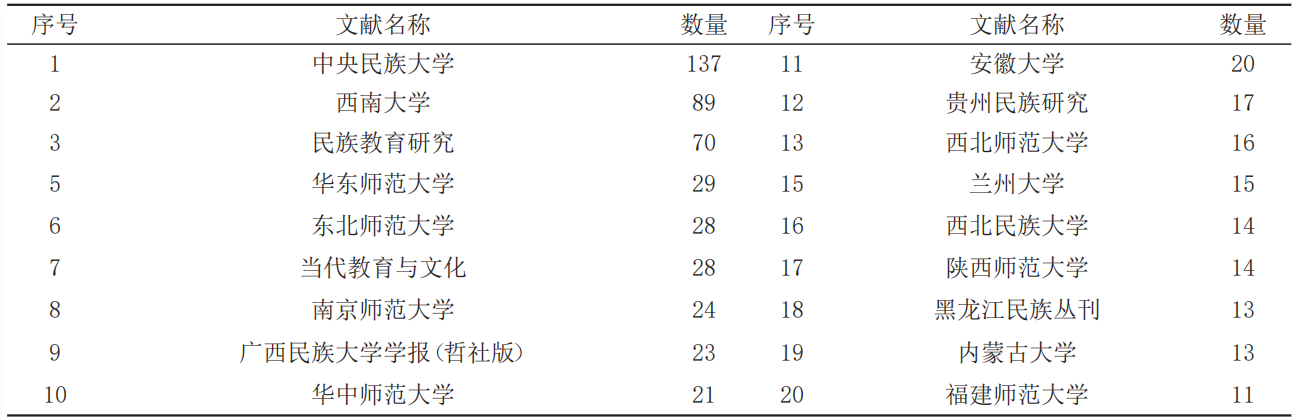 对论文发布的文献来源分布进行统计,发现近年来关于教育人类学的研究文献大多集中在学位论文上,这其中绝大部分集中在具有民族学一级学科博士点的研究机构中(如表7)。