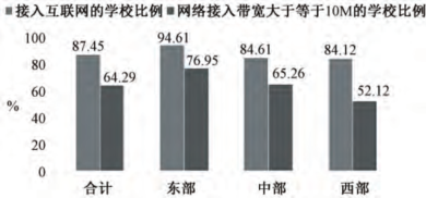 西部地区与中、东部地区的教育信息化基础支撑环境建设水平的区域差距、城乡差距、校际差距较大(见图3)。尽管接入互联网的学校比例差距并不是很明显,但在现有的接入网络的学校中,西部民族地区网络宽带大于或等于10M的仅有52.12%,比全国平均比例低了12个百分点,而东部地区却高达76.95%,中部也达65.26%。