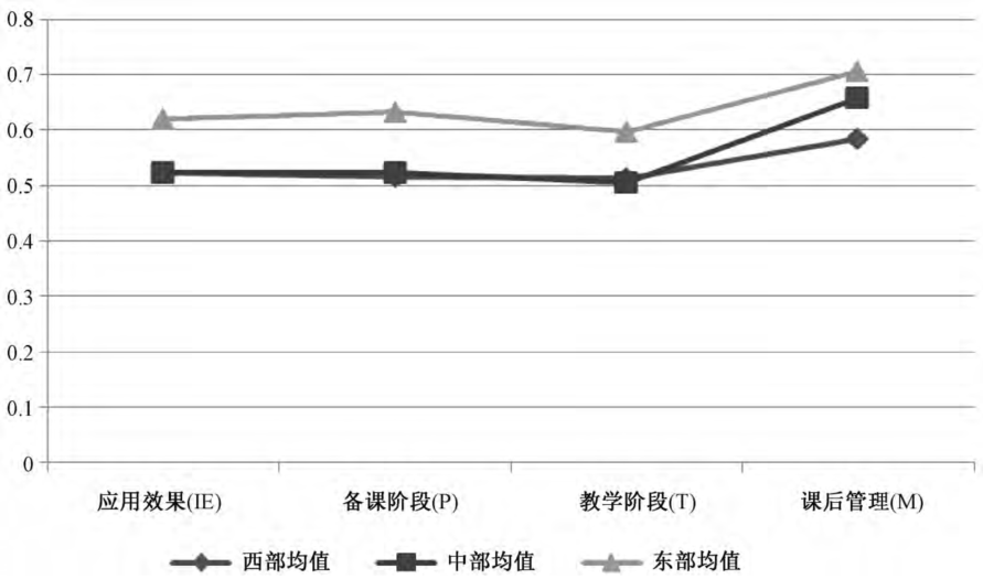 《教育信息化2.0时代》提出:要支持深度贫困地区教育信息化发展,引导教育发达地区与薄弱地区通过信息化实现结对帮扶,实现“互联网+”条件下的区域教育资源均衡配置机制,缩小区域、城乡、校际差距,缓解教育数字鸿沟问题,实现公平而有质量的教育。[7]教师的城乡区域、性别、年龄、学科、学历等影响教师信息化教学。西部地区,尤其是农村地区更有教师对信息技术认知模糊、设备使用率低以及现有信息教育培训效果不佳等现象。在分别选取东部、中部、西部10所中小学进行信息技术教学应用水平分析发现:东部信息技术应用效果最高的为0.787,最低为0.527,效果跨度为0.26;中部地区信息技术效果最高的为0.78,最低为0.309,效果跨度为0.471;西部地区信息应用效果最高的为0.639,最低为0.369,效果跨度为0.27。[8](见图2)