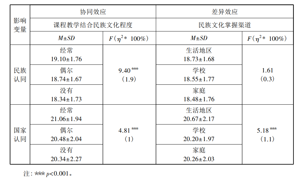 对学校环境变量进行统计分析发现,课程教学结合民族文化程度变量对国家认同和民族认同具有显著的协同认同效应,经常接受结合民族文化教学活动的青少年,他们的双重认同均显著高于未接受的青少年。效应量结果进一步表明,该变量对民族认同的影响大于国家认同。这说明,学校教育是学生增强认同的重要场所,青少年可以通过接受民族文化的教学内容,提高认同度,特别是民族认同。对民族文化了解渠道变量进行统计分析发现,其只对国家认同产生显著影响,对民族认同没有显著影响。这说明,提升青少年国家认同的信息渠道,主要是来自除家庭和学校之外的社会生活环境。总之,学校相关变量结果说明,学校可以通过有效开展民族文化的课堂教学活动,增强青少年的民族认同和国家认同,特别是民族认同;同时,我们也应通过营造一个良好的社会环境(国家文化氛围),积极地影响青少年,提升他们的国家认同度。