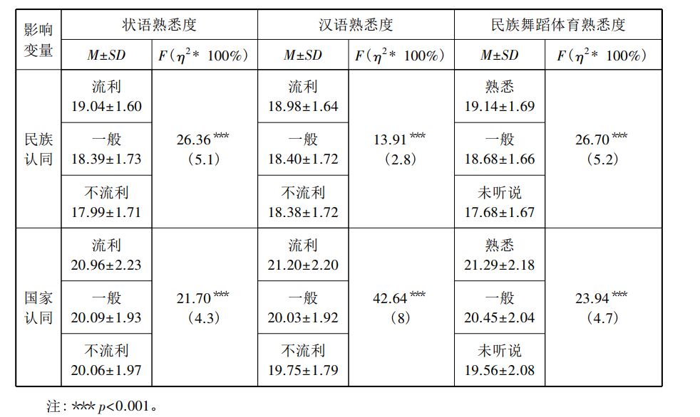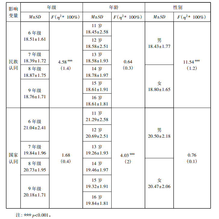 双重认同之间的协同性和差异性体现在影响双重认同的具体因素,及各因素作用于认同的机制等方面。通过编制标准化测验工具,我们不仅可以对个体的双重认同强度进行度量,还可以进一步找出双重认同的因素影响,并对各因素作用机制进行分析。以往研究发现,性别[8][9][10][11]、年级[12][13]、年龄[14]、父母的民族身份[15]、学历(教育程度)[16][17][18]、少数语言熟悉度[19]、汉语熟悉度[20]、居住地[21][22]、双语教育[23]等因素均可以影响认同,但是,以往研究者对各因素影响双重认同表现出的协同性和差异性并没有引起足够重视,对这些影响因素缺乏系统研究,对相关因素的作用机制探讨也不够深入。对影响因素作用机制分析,有利于我们更好地理解和把握民族认同、国家认同及二者关系形成和发展规律,从而为我们更好地处理双重认同关系提供实证支持。例如,何朝峰和罗之勇研究发现,性别、父母民族身份及母亲文化程度均会影响双重认同,但“是否会仫佬话”和“是否生活在仫佬族聚集区”只对民族认同有影响,对国家认同没有影响。[24]本研究拟在前人研究基础上,根据因素(或变量)来源,把双重认同的影响因素分为三类:个体特征变量(包括性别、年龄、年级、状语熟悉度、汉语熟悉度)、家庭环境变量(包括父母学历、职业、家庭居住地)和学校环境变量(课程教学结合民族文化程度、民族文化了解渠道)。同时,为了衡量各因素影响认同的强度,本文引入效应量(η2)指标,效应量越大,说明该因素影响强度越大,反之越小。