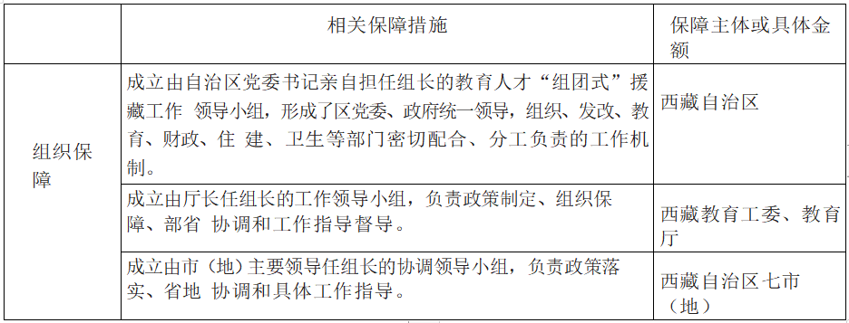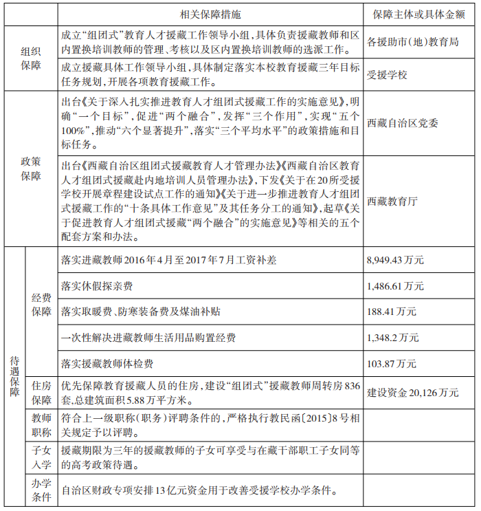“组团式”教育人才援藏工作作为惠及全体藏区人民的重大民生工程,是藏区全面脱贫、全面建成小康社会、实现现代化建设的重要环节,目标的实现需要从组织、政策、待遇等多个方面精心安排部署,强化组织领导,才能保障长效帮扶。在组织方面,西藏自治区建立了区、地教育人才“组团式”援藏两级政府工作领导体系和区、地、校三级教育部门工作领导体系,各市(地)教育局也成立了“组团式”教育人才援藏工作领导小组,形成了强有力的组织保障。在政策方面,针对自治区内不同地区的发展情况,结合援藏省市的相关政策要求,形成了多种援藏配套方案和方法,形成了全方位的政策保障。在待遇方面,从经费、住房、教师职称、子女入学条件以及当地办学条件等多个方面出台具体规定,为援藏教师团队提供丰富的经费保障,提升教师援藏工作的积极性,形成扎实的待遇保障。(具体的实现保障见表2)