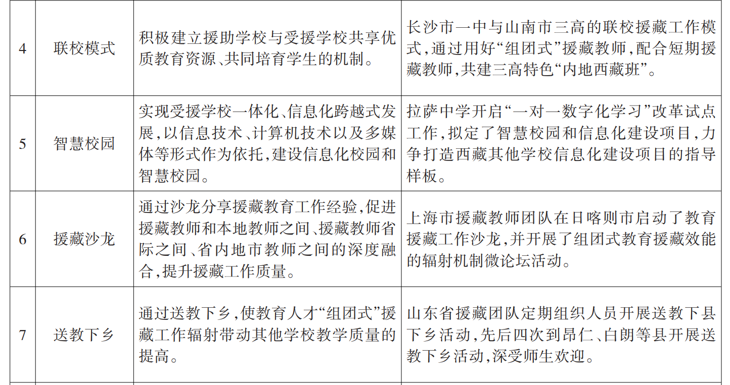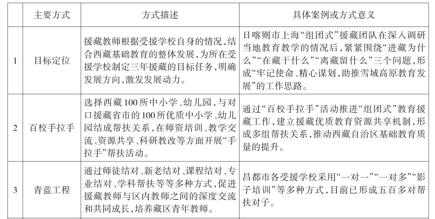 “组团式”教育人才援藏工作以“建好一所学校、代管一所学校、示范一个地区”为总体要求,到目前开展顺利,成果初显。首先,明确目标任务,通过系统化的制度规定,做到明确对口关系和服务期限,规范教育人才援藏的具体工作,实现人才深度培养。其次,完善援助机制,通过“组团式”这一特殊形式,促进教育援藏团队与受援学校的深度融合,建立援助学校与受援学校互帮互助、共享优质资源的常态化机制,形成深度、长期的帮扶支持关系。再次,以“组团式”教育人才援藏为契机,传播先进的教育教学理念,推广先进的教学方法,深化西藏地区教育教学改革,激发各受援学校的办学活力,辐射带动西藏整体教育质量的提升。最后,保证落实相关待遇,通过完善各项激励政策,加强对进藏教育人才的重视和保护。其中,“组团式”教育人才援藏采用了多种形式的活动方法,推动建立起了援助学校与受援学校、援藏教师与当地教师、援藏教师和当地学生等多对相关主体的帮扶机制,充分利用了信息化技术完善相关的制度和平台,形成了“组团式”教育人才援藏独特的实现方式。(如表3所示)通过这些多种多样的实现方式,“组团式”教育人才援藏真正提升了藏区学生的受教育水平和藏区教师的整体教育教学质量,被誉为“家门口的内地西藏班”[8]。