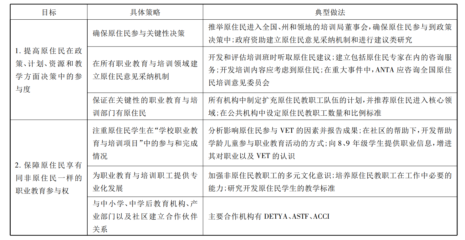 澳大利亚原住民职业教育的迅猛发展离不开政策的推动,在AEP确立的原住民教育长期发展目标下,澳政府对原住民VET的重视程度逐步加深,政策的内容也由模糊变得清晰。在1992年VET国家战略中,澳政府从职业教育的全局出发,立足澳大利亚经济产业、澳大利亚人两个方面提出政策目标,但并未提及原住民职业教育相关内容。而1998年VET国家战略明确提出要实现VET结果公平,仅指出要提高原住民在VET尤其是高资助项目的参与率,降低辍学率,提升毕业率,进而改善其就业状况。2004年VET国家战略提出推动包含原住民在内的职业教育全纳性已经成为了首要目标,对提高原住民受职业教育机会的具体措施进行了明确的标识,还首次提出要将原住民的文化融入至职业教育的相关课程之中,以此来提高原住民学生的学习效果。除了VET国家战略中涉及原住民的相关内容之外,为快速推动原住民职业教育实施效果,2000年首个国家层面原住民职业教育与培训政策:《原住民职业教育与培训国家战略》出台,同年还出台了与该战略相匹配的《执行蓝皮书》,对原住民职业教育具体实施进行了详细的规定。
