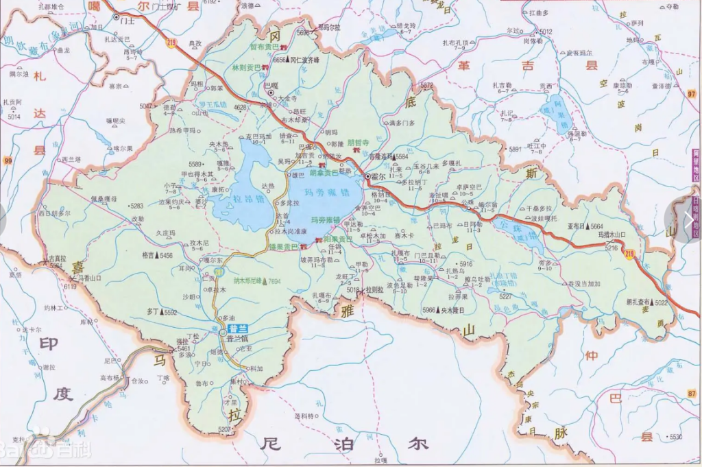 普兰县,隶属于中国西藏阿里地区。位于西藏自治区西南部、阿里地区南部、喜马拉雅山南侧的峡谷地带及中国、印度、尼泊尔三国交界处。普兰县海拔3900米。地处马甲藏布流域,具有山地灌丛草原景观。普兰县城地形特殊,纳木阿比峰和那尼雪峰之间的孔雀河(马甲藏布)谷地,是阿里地区中“雪山环绕的地方”。普兰县城位于纳木那尼雪峰和阿比峰之间的孔雀河(马甲藏布)谷地,与尼泊尔、印度相邻。该地区主体民族为藏族。
