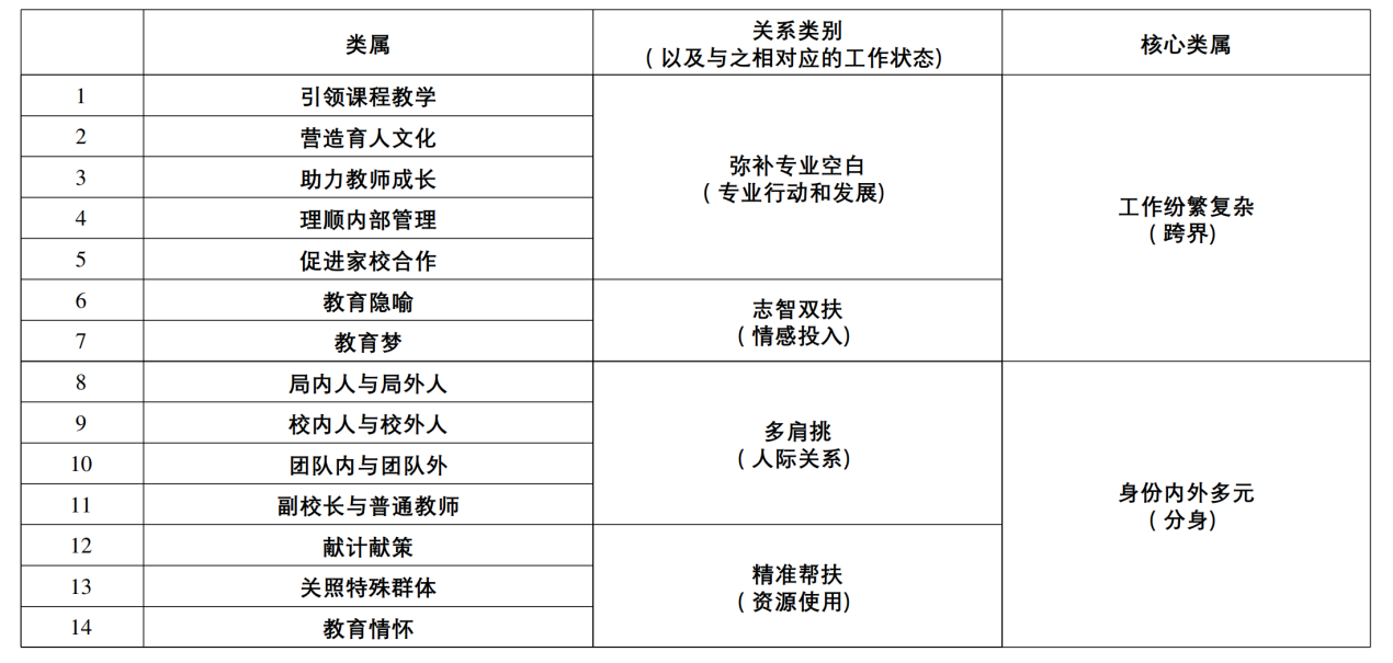 在资料搜集与分析过程中,“我们不是在一大批未经解释的资料及极浅的描述上,而是在能使我们与陌生的人们建立起联系的科学的想象力上,衡量我们的解释是否具有说服力。”[29]具体而言,凭借参与式观察、无结构式访谈等研究方法,我们从最初“捕获”的实地文本(例如日记、田野笔记)到要求制度性提交临时性研究文本(例如工作简报)再到深度访谈,其意在于“与参与者之间就临时性研究文本展开对话,引导探究者重新返回实地并和参与者一起展开更深入的研究”[30],直至最终的研究文本形成引领课程教学、营造育人文化、教育隐喻、局内人与局外人、校内人与校外人、关照特殊群体等14大类属,归纳出弥补专业空白、志智双扶、多肩挑、精准帮扶四个关系类别,提炼出工作纷繁复杂与身份内外多元两个核心类属,由此揭示出支教教师工作状态的两大核心特征:跨界与分身(见表1)。