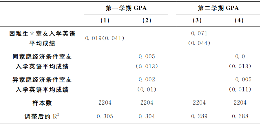 最后,本研究将室友分成同家庭经济条件室友和异家庭经济条件室友,构建了回归模型(5):