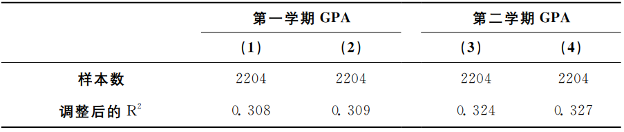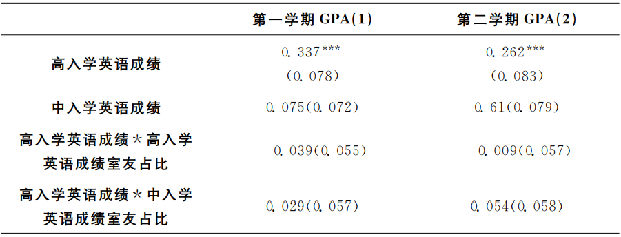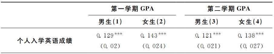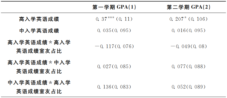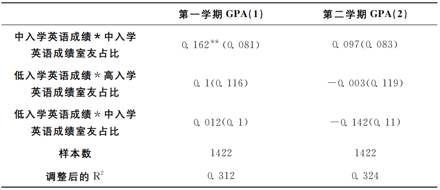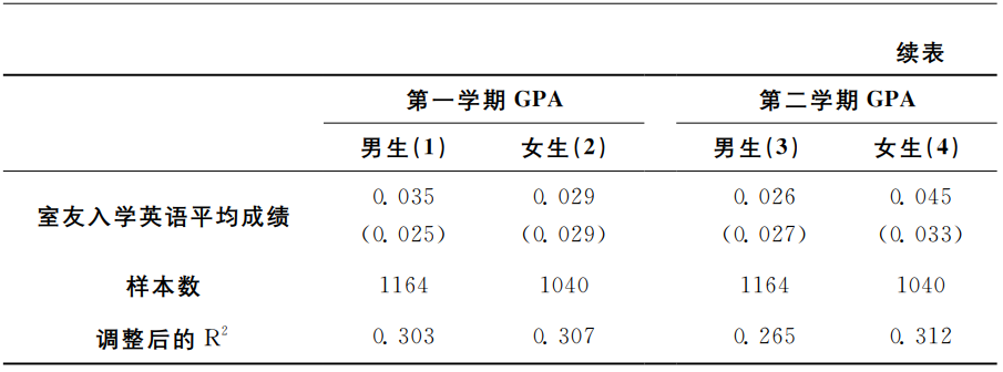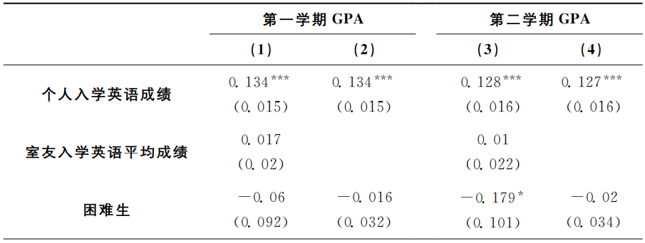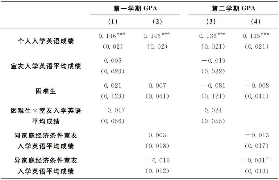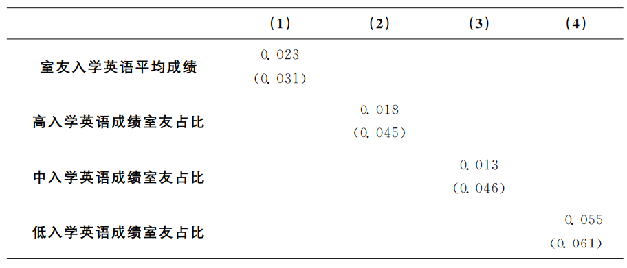 表4是模型(1)的OLS回归结果。第(1)、(2)列分别以学生个人大一第一学期GPA、学生个人大一第二学期GPA为因变量。结果显示,室友入学英语平均成绩的系数不显著,表明平均意义上室友学习能力对个人大一学业成绩没有显著影响。此外,个人入学英语成绩与个人大一GPA显著正相关。