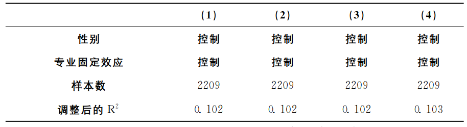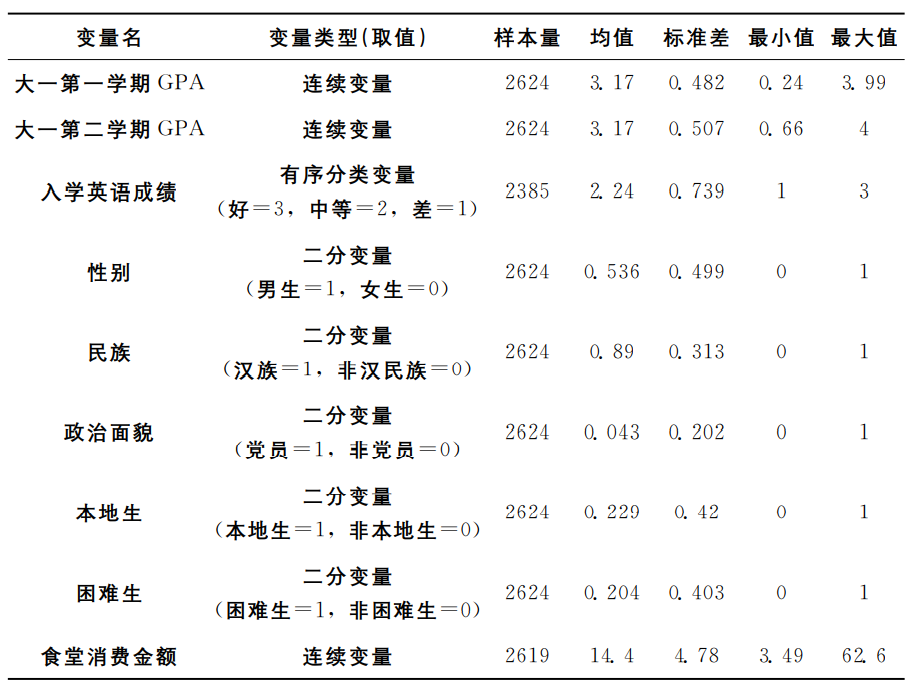 本研究的控制变量包括学生个人特征和家庭背景。学生个人特征包括:性别、民族、政治面貌、生源地、个人入学英语测试成绩、专业、宿舍规模和宿舍楼栋号;其中生源地、专业、宿舍楼栋号是以固定效应的形式加入回归模型。
