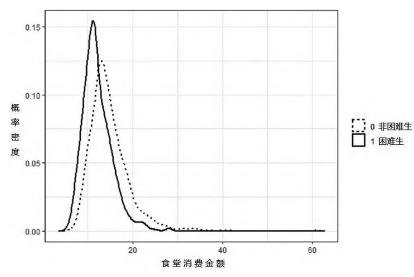 图1困难生与非困难生食堂消费金额概率密度图
