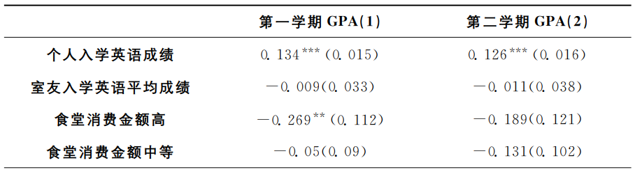 ②如果不依据食堂消费金额对学生进行分类,用食堂消费金额与室友入学英语成绩进行交互,大一第一学期的交互系数正显著(交互系数为0.012,标准误为0.004),大一第二学期的交互系数不显著,回归结果性质与表6一致。
