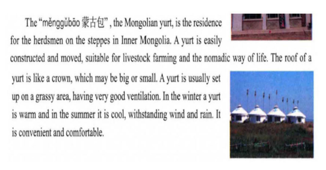 针对少数民族“物质形象”的考察主要从“服饰、食物、建筑、工具”4个方向入手。根据统计,少数民族建筑在“物质形象”这一维度中出现的频率最高,4套教材共50例。其中,藏族寺庙、蒙古包、苗族吊脚楼村寨等都是最常出现的信息。例如,《新实用》第一册在谈论中国特色建筑时,便对蒙古包的形状、作用、特色等作了较为详细的介绍(见图5)。除建筑之外,四套教材对少数民族服饰、食物和工具都有所展现,且数量相当,均在20到35例之间。
