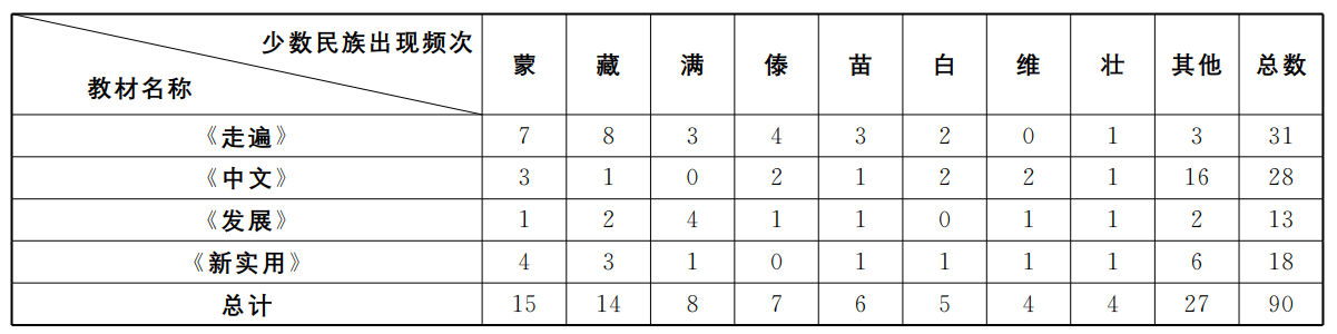 在对少数民族信息的呈现方式有了初步了解后,我们对各民族的出现频次进行了统计(见表5)。首先,共有22个少数民族被选定教材明确提及,其中4套教材均提及蒙、藏、苗、壮4个少数民族,其中又以蒙、藏两民族的出现次数最高,分别为15例和14例。除了表5中呈现的少数民族外,朝鲜族、侗族、土家族、瑶族、哈萨克族、哈尼族、回族、高山族等出现在教材中。其中,《中文》中提及的少数民族种数最多,并出现了如柯尔克孜族、塔吉克族、拉祜族等人口较少的少数民族。
