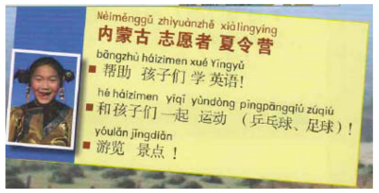 参考Martine& Rose以及Zhang在其研究中对视觉模态的评判准则[31],文章从“情感、判断、鉴赏”3个维度对所选教材中与少数民族相关的图片信息进行评价。首先,情感态度可以通过图片中人物的面部特征展现。其中微笑、大笑、惊喜等属于积极的情感态度,反之,悲伤、流泪、气愤等都被视作消极的情感态度。对于面部情绪不明朗的图片信息,其情感态度为模糊,而以非人为主体的图片信息,则被判定为没有情感态度。其次判断态度可以通过图中人物的姿态、活动、眼神等加以判断。若人物的身体语言表现出了威严、钦佩、支持、期待、舒适等状态,则能体现积极判断;若人物身体明显地反映出疲劳、轻蔑、愚昧、绝望等表征,则为消极判断;图中人物没有明显的身体语言时,则为模糊判断。同理,以非人为主体的图片信息,被视为没有判断。最后,鉴赏则是通过吸引力及美学价值来判断的。具体来说,若图片信息中呈现风景、山水、古建筑、歌舞、服饰、美食等能清晰传递正面美学价值的事物,则为积极鉴赏;若图片信息传递的是破败、病态、闭塞、暴力、穷苦等美学感受,则为消极鉴赏;若图片信息中传递了不清楚,或者多种对立的美学感受时,则为模糊鉴赏。以《走遍》第一册招募内蒙古志愿者夏令营的宣传图为例(见图10),可以清晰地出观察到蒙古族孩子的面部表情,微笑体现了积极情感,吐舌头等动作既显示了孩子对于“内蒙古夏令营”的期待,又传达了其调皮、乐观的性格特征,属于积极的判断。最后,此图中蒙古族孩子鲜艳的民族服饰和头饰都具有正向的美学价值,因此,该图片可判定为积极的鉴赏。