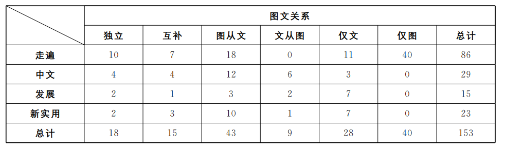 从两种模态的出现频率来看,“图从文”和“仅图”关系出现频率较高,分别有43例和40例。“仅文”次之,有28例,其余的“图文独立”“图文互补”和“文从图”关系相对较少,各有18例、15例和9例(见表4)。